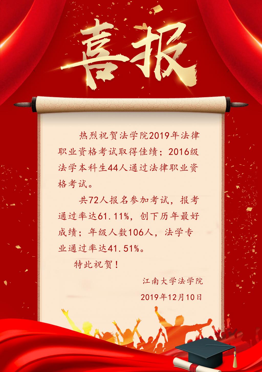 热烈祝贺英国威廉希尔公司官网2019年法律职业资格考试取得佳绩;2016级法学本科生44人通过法律职业资格考试。