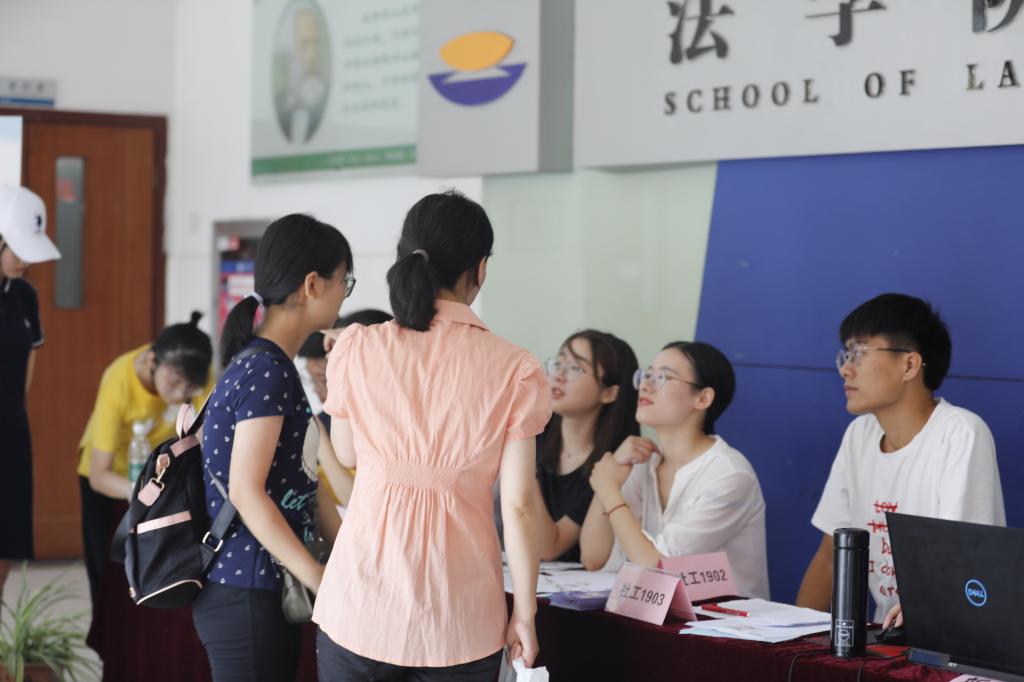 英国威廉希尔公司官网高度重视2019级新生迎新工作。学院于7月初安排部署迎新工作,制定了内容详尽、安排细致的迎新工作时间表和分工表,并针对新生班主任、副班主任进行了集中培训,纵向协商,横向协作。迎新当天,英国威廉希尔公司官网在学院内外设置十一面专业引领介绍,涵盖学院介绍、平台基地、专业发展、优秀校友、考研出国、社会实践等详细内容的特色展板,重专业导入;设计以朋友圈为主题,配合"小法官卡通人物形象"的特色合影墙,展法学特色;制作新生指南、设置新生咨询点、报到处、绿色通道办理处、家长休息室等,提供周到的服务;喜迎19级新生,亲切问候学生家属、耐心回答问题,帮助他们由此展开一段崭新的人生旅程。
