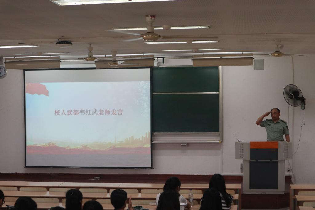 在雄壮的国歌声中,大会拉开帷幕。首先,校人武部韦红武老师为全体同学带来了慷慨激昂的演讲。韦老师表示军训不仅仅是国防教育、素质教育的要求,更是我们锻炼吃苦精神,增强国防意识,增加集体凝聚力的良机。“国无防不立,民无兵不安。”增强国防意识,居安思危,是每一个大学生应尽的义务,只有我们每个人都能做到自信、自强、自立,才能造就一个自信、自强、自立的民族,才能成就中华民族的伟大复兴。韦老师提出,希望同学们在接下来为期16天的军训中能以“有灵魂、有本事、有血性、有品格”的新一代革命军人的标准严格要求自己,在军训过程中戒骄戒躁,克服困难,努力奋斗,真正做到“流血流汗不流泪,再苦再累不掉队。”为自己今后的人生留下美好的回忆。韦老师激情四射的讲话得到全体同学极大的反响,台下掌声不断。