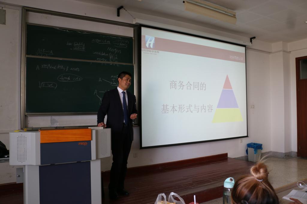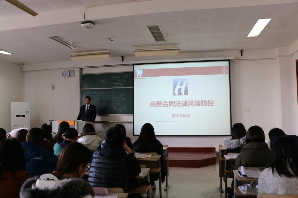 2017年12月8日下午,学院在第二教学楼举办了关于商务合同的专题讲座。海辉律师事务所李克章律师应邀与法学专业学生,共同探讨了涉及商务合同