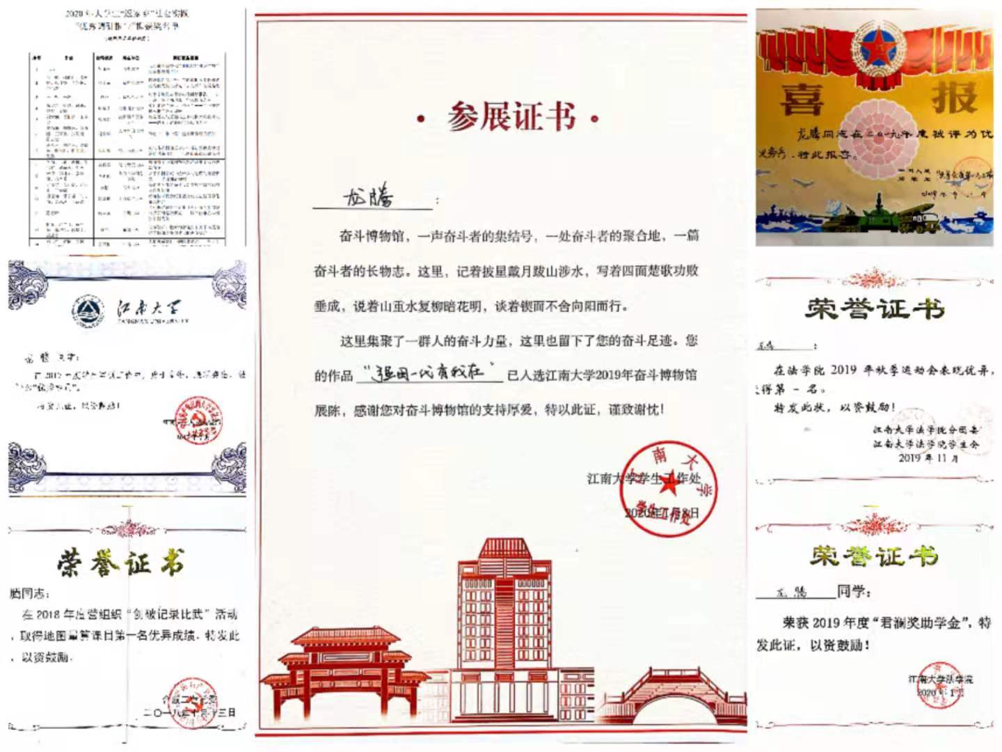 最美好的青春岁月献给祖国!主动选择吃苦的龙腾于2017年9月主动参军入伍,奔赴祖国最艰苦的一线部队服役,在军营中尽情挥洒汗水。他屡次被连队委以重任,奔赴阜新参与新兵训练工作、葫芦岛特战比武集训、参加跨区演习大型任务。他曾参与重大军事演习活动,在总攻环节,拼尽全力为连队开辟前进通路,表现突出,荣获“优秀士兵”并记嘉奖一次。在军事训练中,他熟练掌握步枪手、机枪手、文书、卫生员等多个岗位的专业技能,参与各级比武演训活动,夺得营比武单项第一,获评“周训练尖兵”、“进步之星”。除此之外,他发挥大学生士兵的文笔特长,在旅、集团军、战区陆军各级单位发表新闻报道十余篇,被聘为营“新闻报道员”,屡次得到上级机关的肯定与表扬。
