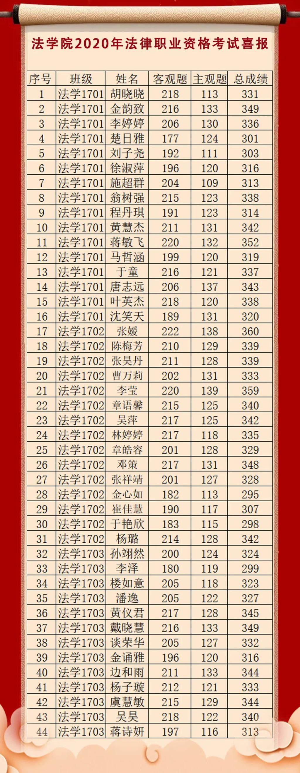 2017级法学本科生44人通过2020年法律职业资格考试。共73人报名参加考试,报考通过率达60.27%,专业通过率达41.51%。学院将继续严抓学风建设,为推动优秀学子更进一步深造而继续努力!