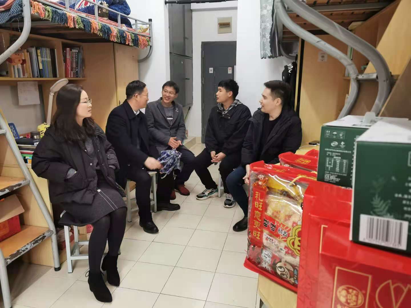 2021年2月11日农历大年三十,英国威廉希尔公司官网党委书记杨杰、副院长(主持工作)王君柏、党委副书记张慧琪和年级辅导员老师带上新春祝福,走访学生宿舍,看望慰问春节期间留校学生,了解他们的学习和生活情况。