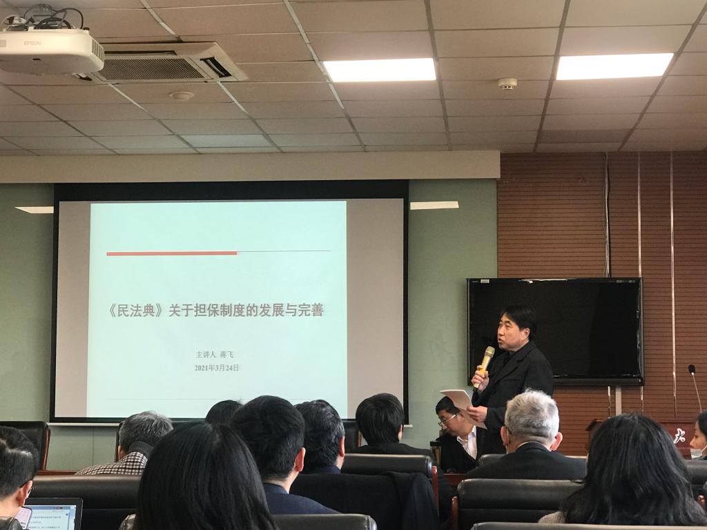 蒋飞结合其丰富的理论实践经验,进行“民法典关于担保制度的发展与完善”主题讲座。他以担保制度的历史沿革为切入点,详细介绍我国担保制度。他指出,民法典中融资担保方式也呈现多元化趋势,非典型担保的涌现也极大推动社会资金流动。同时,民法典强化担保物权的外部公示,消除隐性担保的风险。在此背景下,民法典415条确立的优先权顺位规则为解决权利冲突提供了统一清晰可预见的规制。