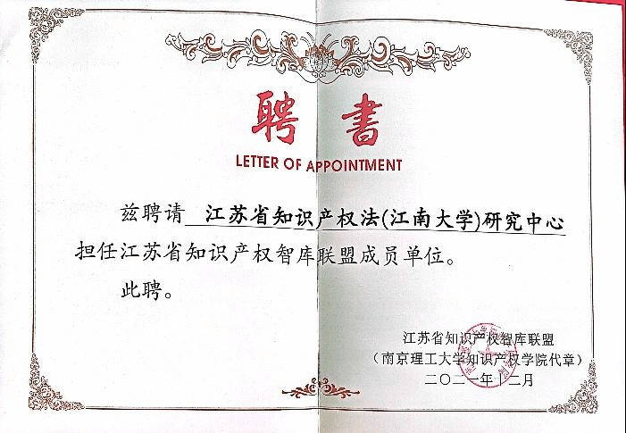 大会听取了江苏省知识产权智库联盟筹备组所作的筹备工作报告,审议通过了《江苏省知识产权智库联盟章程》和倡议书,讨论了江苏省知识产权智库联盟2022年工作计划,并选举南京理工大学知识产权学院戚勇院长担任联盟秘书长。最后,张传博副局长与廖文和书记共同为成员单位颁发联盟成员单位聘书,我院江苏省知识产权法(英国威廉希尔公司官网)研究中心成为首批成员单位。