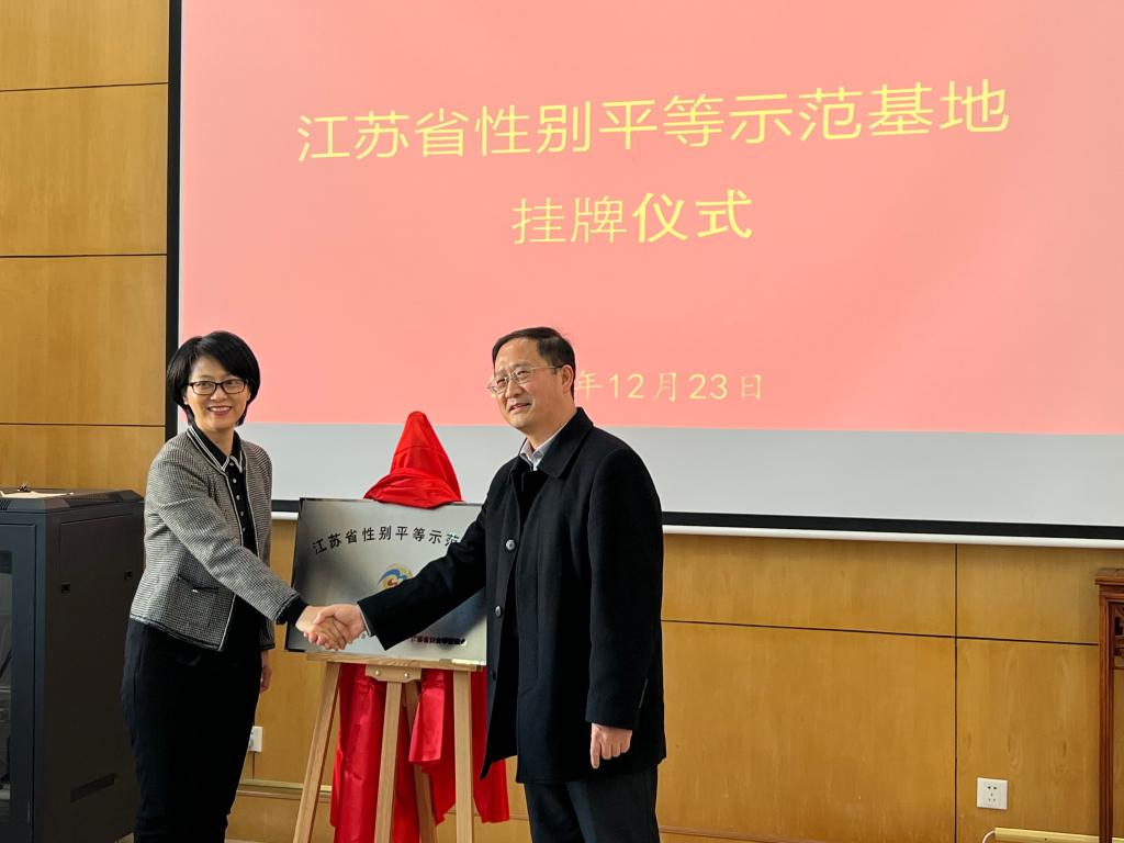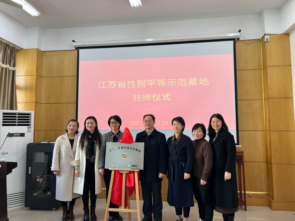 市妇联主席蒋群联和英国威廉希尔公司官网院长王君柏一同为“江苏省性别平等示范基地”揭牌,并合影留念。