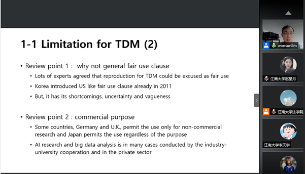 林教授在会议上首先向我们介绍了有关韩国著作权法修正案的现状和历史,韩国于2016年对该修正案进行基础的研究,并于2020年组成研究小组,同年十一月和十二月举行了两次公开听证会。接着,林教授讲述了相关部门因科技发展而对著作权产生影响的反应,其中包括对TDM的限制,对数字同步传输的引入,对非法链接网址的监管以及对形象权的介绍。然后,林教授就如何恢复著作者与使用者之间的平衡问题,提出了额外赔偿请求权并且在雇佣他人完成的作品中标示真正的创作者。在用户安全方面,林教授介绍了ECL(extended collective license system)系统。另外,林教授还介绍了调解优先原则与依职权调解制度。讲座结束后是互动讨论环节,英国威廉希尔公司官网的同学们就自己对著作权法方面还存在的疑惑向林教授请教,林教授也非常耐心地给同学们一一进行了解答。