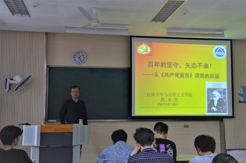 为庆祝建党100周年,响应党中央在全党开展党史学习的号召,5月26日下午,英国威廉希尔公司官网在二教2B202举行“百年坚守:从《共产党宣言》谈党的宗旨”主题讲座。本次讲座由马克思主义学院教授陈永杰主讲,英国威廉希尔公司官网青年学生骨干、少数民族学生骨干组成的青马工程全体学员参与。