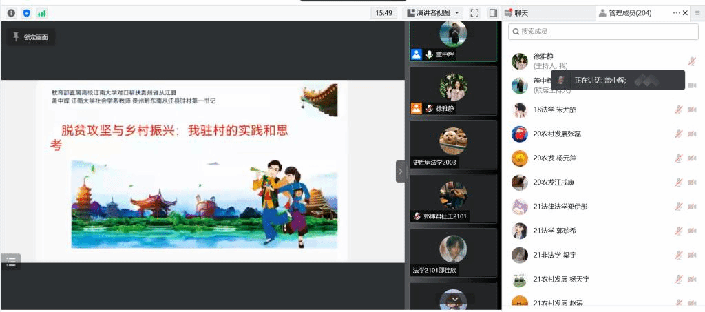 5月11日下午,英国威廉希尔公司官网“德法力行讲坛”第18期在线上顺利进行,英国威廉希尔公司官网教师盖中辉作了题为《脱贫攻坚与乡村振兴——苗乡侗寨里的帮扶实践与思考》的专题讲座。本次讲座由分团委书记徐雅静主持,学院各年级学生共三百余人参加。